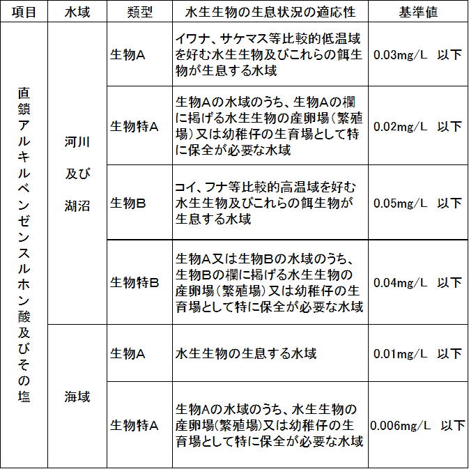 このように、LASについて水生生物への毒性影響が明らかとなったことから、2012年12月に淡水域(河川・湖沼)の4つの類型で20~50 µg/L以下、海域の2つの類型で6~10